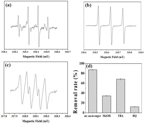 Electron spin resonance (ESR) spectroscopy is utilized to analyze the primary active substances within the NiFe-LDHs/PMS reaction system. Initially, the main active substances in the catalytic degradation of the DC reaction system, activated by NiFe-LDHs, were examined. In Figure 8a, the signals for ·OH (hydroxyl radical) and SO4−· (sulfate radical) can be distinctly observed. The quadruple signal with an intensity ratio of 1:1:1:1 in Figure 8b suggests the existence of O2−· (superoxide anion radical)-active substances. Meanwhile, the signal with an intensity ratio of 1:1:1 in Figure 8c is attributed to the 1O2 (singlet oxygen)-active substances. In order to further analyze the main active oxygen species in the activation of sulfate by NiFe-LDHs, this study conducted free radical quenching experiments with different organic quenchers to further determine the role of different reactive oxygen species (ROS). According to previous research, methanol (MeOH) is a quencher for both OH· and SO4−·, tert-Butanol (TBA) can effectively mask the action of OH·, and 1,4-Benzoquinone (BQ) can inhibit the action of O2−·. In the PMS reaction system, the removal efficiency of doxycycline by the two catalysts under the action of MeOH or TBA was significantly reduced (Figure 8d). OH· can be generated from the rapid conversion of SO4−· and plays an important role in the degradation of doxycycline. When BQ was added to the reaction system, the degradation effect of the two systems on tetracycline was almost zero. Therefore, it can be inferred that O2−· is the main ROS for the degradation of doxycycline by NiFe-LDHs activating persulfate.