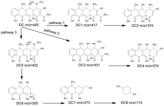 In the second pathway, DC with a mass-to-charge ratio of m/z 445 is degraded to DC3 with a mass-to-charge ratio of m/z 431, losing 14 atomic mass units, suggesting that DC has lost a methyl group, and DC3 with a mass-to-charge ratio of m/z 431 is degraded to DC4 with a mass-to-charge ratio of m/z 374, losing 57 atomic mass units, suggesting that DC3 has lost two methyl groups and an amide group. In the third pathway, DC with a mass-to-charge ratio of m/z 445 is degraded to DC5 with a mass-to-charge ratio of m/z 402, losing 43 atomic mass units, suggesting that DC has lost an amide group; DC5 with a mass-to-charge ratio of m/z 402 is degraded to DC6 with a mass-to-charge ratio of m/z 305, losing 97 atomic mass units, suggesting that DC5 has been oxidized, lost a methylamine group, a hydroxyl group, and undergone ring-opening; DC6 with a mass-to-charge ratio of m/z 305 is degraded to DC7 with a mass-to-charge ratio of m/z 273, losing 32 atomic mass units, suggesting that DC6 has lost a hydroxyl group; DC7 with a mass-to-charge ratio of m/z 273 is degraded to DC8 with a mass-to-charge ratio of m/z 115, losing 158 atomic mass units, suggesting that DC6 has lost a water molecule, a methyl group, and a hydroxyl group, and undergone ring-opening; DC7 with a mass-to-charge ratio of m/z 273 is degraded to DC8 with a mass-to-charge ratio of m/z 115, losing 59 atomic mass units, suggesting that DC6 has lost a hydroxamic acid group.