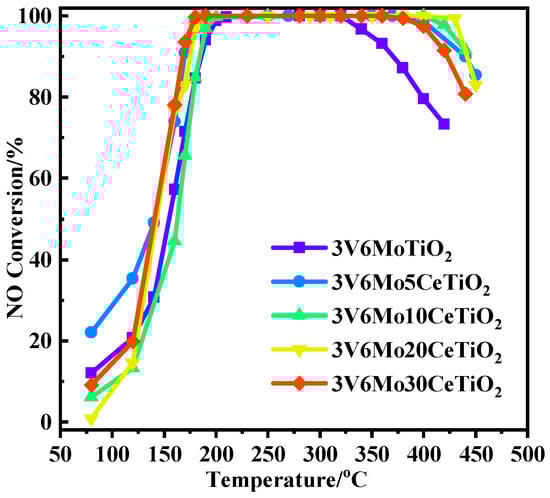 NO conversion over the 3V6MoxCeTiO2 catalysts. Reaction conditions: [NO] = [NH3] = 1000 ppm, [O2] = 6 vol%; N2 (balance); total flow rate = 500 mL/min; GHSV = 30,000 h−1.