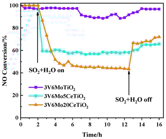 The influence of SO2 and H2O on the NH3-SCR reaction activity of 3V6MoTiO2, 3V6Mo5CeTiO2, and 3V6Mo20CeTiO2 catalysts was investigated in a simulated flue gas atmosphere at 200 °C. As illustrated in Figure 2, in the absence of SO2 and H2O, the NO conversion rates for the three catalysts, were nearly or entirely 100% at the experimental temperature of 200 °C. However, upon the introduction of 100 ppm SO2 and 10% H2O into the simulated flue gas, the NO conversion rates of the 3V6Mo5CeTiO2 and 3V6Mo20CeTiO2 catalysts dropped rapidly compared to 3V6Mo5CeTiO2. More specifically, the NO conversion rate of the 3V6Mo5CeTiO2 catalyst dropped to 60% within 30 min of the SO2 and H2O introduction and remained nearly constant for the following 10 h, after which the introduction of the contaminants (SO2 and H2O) was stopped. Once the introduction of the contaminants ceased, the NO conversion rate gradually recovered, reaching only approximately 65%. In comparison, the NO conversion rate of the 3V6Mo20CeTiO2 catalyst declined more gradually, reaching approximately 45% within 2 h of the introduction of the contaminants, and then remained nearly constant at this level for the next 7 h until the mixture (SO2 and H2O) flow was stopped. The conversion rate then swiftly recovered to around 67% and increased as time progressed. Thus, based on the results of this study, it can be indicated that the incorporation of CeO2 into the V2O5-MoO3/TiO2 catalyst diminished its resistance to sulfur and water poisoning. Furthermore, an increase in the CeO2 further aggravated the catalyst’s resistance to sulfur and water contamination.