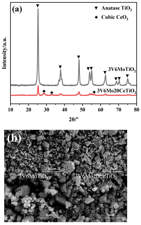 (a) XRD patterns and (b) SEM images of the 3V6MoTiO2 and 3V6Mo20CeTiO2 catalysts.