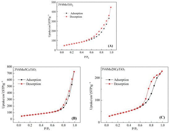 N2 adsorption–desorption isotherms of 3V6MoTiO2 (A), 3V6Mo5CeTiO2 (B), and 3V6Mo20CeTiO2 (C) catalysts at liquid N2 temperature.