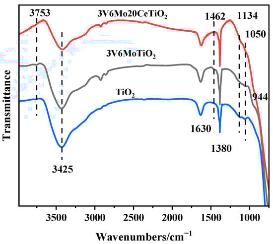 Figure 5 compares the FT-IR spectra of the catalyst support (TiO2), the pristine catalyst (3V6MoTiO2), and the modified (3V6Mo20CeTiO2). An analysis showed that the transmission bands around 3425 and 1630 cm−1 could be attributed to -OH groups (adsorbed water) on the TiO2 particles. Moreover, the bands at ca. 1134 and 1050 cm−1 originated due to residual trace sulfate ions in the raw TiO2 [16,17]. A comparison of the spectra showed that when VOx and MoOx were added to TiO2, the intensity of the bands at ca. 1134 and 1050 cm−1 reduced, which could be attributed to the decomposition of some sulfate ions during the ball milling process. Interestingly, when CeOx was introduced into the catalyst structure, these bands (ca. 1134 and 1050 cm−1) disappeared entirely, indicating the complete exclusion of sulfate ions. This absolute removal of sulfate ions in the modified catalyst may be attributed to the CeOx-promoted decomposition of the ions during the ball milling process due to the strong interaction between sulfate and CeOx over TiO2 [18].