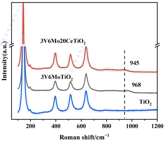 The Raman spectrum of TiO2 revealed four characteristic bands at ca. 140, 393, 515, and 637 cm−1, indicative of the anatase phase [19]. These peaks were also retained by the pristine and modified catalyst samples due to the presence of TiO2 support in these materials. In addition, a low-intensity band around 968 cm−1 due to the stretching mode of the terminal molybdyl unit (Mo = O) could be observed for the pristine catalyst (3V6MoTiO2), indicating the presence of orthorhombic MoOx [20]. Meanwhile, the addition of CeO2 red shifted this peak to 945 cm−1 in the modified catalyst (3V6Mo20CeTiO2) spectrum, indicating an interaction between CeO2 and MoOx. In addition, the low-intensity peaks at ca. 322 and 459 cm−1 in the 3V20CeTi O2 spectrum can be attributed to the displacement of oxygen atoms from their ideal fluorite lattice position to tetragonal positions and the single Raman active mode of F2g symmetry for CeO2 with the cubic fluorite structure phase (c-phase) [21]. Meanwhile, the other bands in the 800–1050 cm−1 range were due to the vanadium component in the catalysts, with the broadband around 939 cm−1 attributed to polyvanadate chains bound to the catalyst support (TiO2) [22,23]. In Figure 6, we compare the Raman spectra of the TiO2, 3V6MoTiO2, and 3V6Mo20CeTiO2 catalysts. No obvious peak related to the Ce-O bond was found on the 3V6Mo20CeTiO2 catalyst in the figure, which may be due to its small grain size or disordered structure [18].