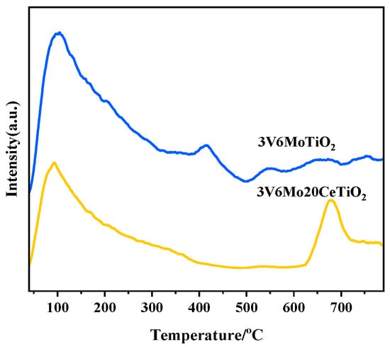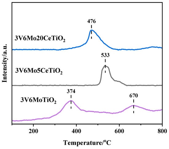 Figure 7 illustrates the H2-TPR profiles of the catalysts. For the sample 3V6MoTiO2, the band around 374 and 670 °C was mainly attributed to the reductions in the vanadium species and the molybdenum species, indicating the well dispersion of oxides using the ball milling method [24]. Meanwhile, in the previous research, the sample VMTi showed better activity with reduction peaks at around 455 and 715 °C, implying that easily reduced vanadium oxides in the V2O5-TiO2 catalyst were not the only determinant factor for high performance. Moreover, the well-dispersed vanadium species with high oxidation activity was averse to NH3-SCR reaction at high temperatures. As CeO2 was introduced, there was a prominent reduction peak in the 350–600 °C temperature range, which can be primarily attributed to the vanadium oxides, surface CeO2, and the interactions between them [9,25]. Due to the interaction of the CeO2 and VOx species, the reducible property of the sample varied, showing the decrease in well-dispersed vanadium species. This is one reason for the catalyst with a wide temperature window for NH3-SCR. With the amount of CeO2 raised, more isolated CeO2 stayed on the support; the intensity of the reduction peak increased, and the reduction temperature shifted to a low temperature.