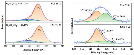 The resolved O 1s and V 2p XPS of the pristine and modified catalysts are depicted in Figure 9. It can be seen that the O 1s spectrum of the two catalysts may be fitted with two peaks positioned around 529.80 eV and 531.23 eV that can, respectively, be attributed to the lattice oxygens (Oβ, oxygen in the crystal lattice) and chemisorbed oxygen (Oα) on the catalyst surface. A quantitative analysis based on the area integration of these peaks revealed 19.45% and 17.71% Oα on the 3V6Mo20CeTiO2 and 3V6MoTiO2 catalysts, respectively. Since chemisorbed oxygen on the catalyst surface exhibited better mobility, higher reactivity, a more significant migration rate, and faster NO oxidation, the higher proportion of Oα in the modified catalyst could be beneficial for the progress of “fast” SCR reactions, leading to superior catalytic performance [26].
