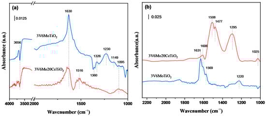 The DRIFT spectra of the pristine (3V6MoTiO2) and modified (3V6Mo20CeTiO2) catalysts in the presence of NH3 and NO in the O2 environment at room temperature are presented in Figure 10a and Figure 10b, respectively. It can be observed that the infrared absorbance peak intensities were clearly different for the two catalyst samples in both the NH3 and NO presence. In the case of NH3 presence (Figure 10a), the 3V6MoTiO2 catalyst showed absorbance at 3656, 1630, 1326, 1230, and 1095 cm−1, with the negative band at approximately 3656 cm−1 attributed to the consumption of the catalysts’ surface hydroxyl (−OH) groups [27], whereas the bands at 1630 and 1149 cm−1 represented the coordination of NH3 onto the Lewis acid sites present on the catalyst’s surface [28]. In addition, the catalyst showed the weak adsorption of NH3 species on the Lewis acid sites and a small amount of ammonia oxidation intermediates, as indicated by the bands at 1095 and 1326 cm−1, respectively [29]. Additionally, the peaks at 1230 and 1360 cm−1 were indicative of the formation of bidentate [30] and monodentate nitrites [31] on the pristine catalyst in the presence of NH3:O2, respectively. Collectively, the DRIFT analysis of the 3V6MoTiO2 catalyst suggested a certain oxidation capability of the pristine catalyst toward the NH3 adsorbed on its surface in the presence of O2, thus potentially accounting for its narrower temperature window of operation. Upon introducing CeO2, the DRIFT peak intensity of the catalyst (in the presence of NH3) at 3656 cm−1 diminished significantly. This decrease may indicate a reduction in the 3V6Mo20CeTiO2 surface -OH groups, possibly due to the interactions between CeO2 and the TiO2 support, consistent with the NH3-TPD results. Meanwhile, a new peak appeared at 1516 cm−1, indicating -NH2 species, which may be formed by hydrogen abstraction from the coordinated NH3 on the Lewis acid sites [32] of the modified catalyst. These -NH2 species could react with gaseous NO to form NH2NO, which could then decompose into N2 and H2O, resulting in the SCR reaction. Thus, because of this possible mechanism, the incorporation of Ce into 3V6MoTiO2 could improve its low-temperature activity.
