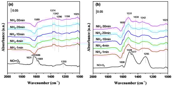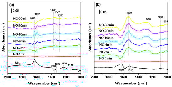 To identify the role of adsorbed NH3 species in the SCR process on the 3V6MoTiO2 and 3V6Mo20CeTiO2 catalysts, fresh catalyst samples were pretreated with NH3 and O2, followed by exposure to NO, recoding the DRIFT spectra at various time intervals, as provided in Figure 11. The results showed the appearance of several bands (Figure 11a) corresponding to adsorbed NH3 species and NH3 oxidation products following the NH3 and O2 pretreatment of the 3V6MoTiO2 catalyst. However, these bands became weaker in intensity after introducing NO, indicating the consumption of the adsorbed NH3 species in the reaction. With the increasing reaction time, except for the monodentate nitrite and nitrate (1374, 1342, and 1292 cm−1) and adsorbed H2O (1597 cm−1) [37,38], the peak attributed to the Lewis acid sites (1630 cm−1) always existed and did not fully participate in the reaction. A different trend was observed in the DRIFTs of the 3V6Mo20CeTiO2 catalyst (Figure 11b), whereas the peaks for the pre-adsorbed NH3 species reappeared. Upon NO introduction, the peak intensity at 1630 cm−1, attributed to the Lewis acid sites on the catalyst, remained weakened with time, suggesting its continuous participation in the reaction with NO. Moreover, the peaks attributed to bidentate nitrate (1539 and 1025 cm−1) [30] and monodentate nitrate (1268 cm−1) [39] appeared rapidly within 2 min of the introduction of NO, with their intensity significantly higher than that of the 3V6MoTiO2 catalyst, suggesting that the adsorbed NH3 species on the 3V6Mo20CeTiO2 catalyst were more reactive compared to that on the 3V6MoTiO2 catalyst. Thus, the 3V6Mo20CeTiO2 catalyst appeared more conducive to promoting the SCR reaction. Since the results show that the adsorbed NH3 and gaseous NOx species are critical in the transient SCR reaction, the applicability of the Eley–Rideal (E-R) mechanism can be verified for this process.