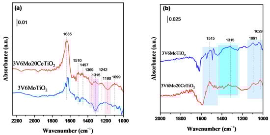 Furthermore, the analysis from the DRIFTs obtained in the presence of NO + O2 (Figure 10b) indicated the presence of adsorbed NO2 (1606 and 1631 cm−1) [33], bidentate nitrates (1569 cm−1), and bridging nitrate (1220 cm−1) [34] on the 3V6MoTiO2 catalyst. Clearly, compared with the 3V6MoTiO2 catalyst, the intensities of monodentate nitrate were enhanced and the peak of NO2 and bidentate nitrate decreased or even disappeared on the 3V6Mo20CeTiO2 catalysts. The bands at 1295 and 1508 cm−1 could be assigned to monodentate nitrate [35] and the band at 1477 cm−1 was attributed to monodentate nitrite [36]. This decrease in the bidentate nitrate and NO2 species on the 3V6Mo20CeTiO2 catalysts indicated the positive role of CeO2 in the formation of active unstable nitrate, which could promote SCR reactions. Meanwhile, the increase in the other bands’ intensity represented significantly more nitrate species adsorption on the 3V6Mo20CeTiO2 catalyst compared to 3V6MoTiO2, indicating its stronger adsorption and oxidation capacity for NO.
