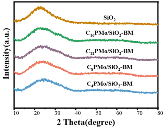 The polyoxometalate ionic liquid ([Cnmim]3PMo12O40, n = 4, 8, 12, 16) was prepared through the ion exchange of phosphomolybdic acid (H3PMo12O40) and imidazole chloride ([Cnmim]Cl, n = 4, 8, 12, 16). Then, silica-supported polyoxometalate ionic liquids (CnPMo/SiO2-BM, n = 4, 8, 12, 16) were obtained by mixing commercial silica and polyoxometalate ionic liquids via a facile ball milling method. XRD measurement is an effective method to characterize crystallinity and structural information in solid materials [23]. Figure 1 shows the XRD spectra of supported polyoxometalate ionic liquids after ball milling. A diffraction hump of SiO2 can be observed in the range of 15°–40° for all catalysts, indicating an amorphous structure in the samples. However, no obvious diffraction shift for CnPMo/SiO2-BM (n = 4, 8, 12, 16) was observed compared to that of pure SiO2, indicating the successful introduction of POM ionic liquids on the surface of SiO2 [24].