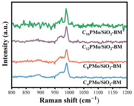 Raman scattering spectrogram was used to explore the presence of molybdenum incorporated into the hybrid materials (Figure 3). The main peak positions of the catalyst are provided as follows: 950–1000 cm−1, 885–900 cm−1, 590–605 cm−1, and around 248 cm−1. The bands in the range of 950–1000 cm−1 and around 248 cm−1 are attributed to the stretching vibration of the Mo-O bond. The peaks in the range of 885–900 cm−1 are ascribed to the tensile vibration absorption peak of Mo-Ob-Mo, while the characteristic absorption peak of Mo-Ob-Mo is represented by 590–605 cm−1. No significant change in the Raman peaks of the samples was observed, indicating the uniform dispersion of the molybdenum sites on the carriers.