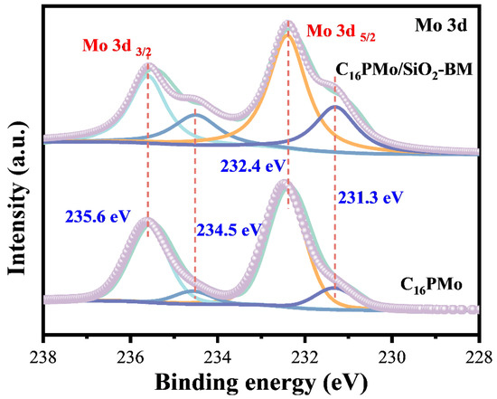To obtain further information about the Mo chemical state of the catalysts, the surface Mo elemental morphology of C16PMo and C16PMo/SiO2-BM was investigated using X-ray photoelectron spectroscopy (Figure 4). For the Mo 3d energy spectrum of C16PMo, the peak positions of 232.4 eV and 235.6 eV represent Mo 3d3/2 and Mo 3d5/2, respectively, which are ascribed to Mo (VI). Most of the Mo elements are present in the form of Mo (VI), as well as a small portion of Mo (V), with binding energies of 234.5 eV and 231.3 eV. The formation of Mo (V) may be attributed to the fact that part of the Mo (VI) is reduced to Mo (V) by imidazole cations in the preparation process [26,27]. For the sample C16PMo/SiO2-BM, the ratio of Mo (VI) to Mo (V) valence peak areas in the Mo 3d peaks decreased, suggesting the successful introduction of the POM ionic liquids in the silica via the ball milling method [28].