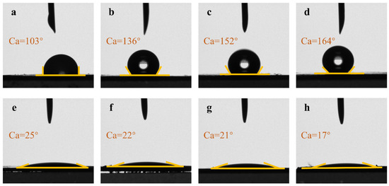 The contact angle on the surface of C4PMo/SiO2-BM, C8PMo/SiO2-BM, C12PMo/SiO2-BM, and C16PMo/SiO2-BM for a water droplet (a–d) and a dodecane (e–h) droplet.