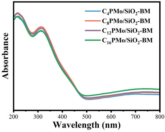 UV-vis spectra of the catalysts are depicted in Figure 8. It can be found that all of the samples have similar absorption peaks in the ultraviolet spectra, and these absorption peaks appear in the range of 200–400 nm. The maximum absorption wavelength is around 315 nm, representing the charge transfer process of Mo-O ligands and metals in the Keggin structure. The absorption peak near 210 nm is related to the charge transfer of P-O bonds [23]. According to the ultraviolet absorption principle of SiO2, no UV absorption for SiO2 would be found beyond 300 nm [31]. For the supported IL materials, the UV absorption beyond 300 nm was related to the polyoxometalate ionic liquid in the catalyst, also indicating the successful introduction of POM sites in the sample.