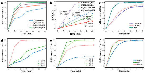 (a) Desulfurization efficiency with different catalysts. Experimental conditions: m (catalyst) = 20 mg, T = 60 °C, O/S = 3. (b) Pseudo first-order kinetic curves of different desulfurization systems. (c) Desulfurization efficiency with different sulfur-containing substances. Experimental conditions: m (catalyst) = 20 mg, T = 60 °C, O/S = 3. (d) Desulfurization efficiency with varied reaction temperatures. Experimental conditions: m (catalyst) = 20 mg, O/S = 3. (e) Desulfurization efficiency with varied O/S molar ratios. Experimental conditions: m (catalyst) = 20 mg, T = 60 °C. (f) Desulfurization efficiency with different catalyst dosages. Experimental conditions: T = 60 °C, O/S = 3.