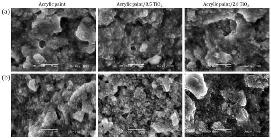 The SEM images of self-cleaning acrylic paint (a) untreated and (b) plasma-treated surfaces with different TiO2 content.