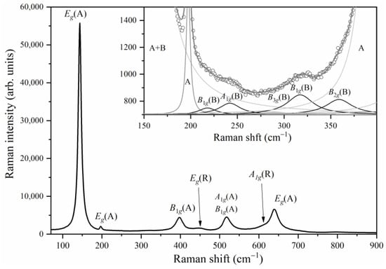 The spectrum of TiO2 powder shown in Figure 3 is dominated by the Raman modes of anatase phase ~144 (Eg), 197 (Eg), 397 (B1g), 517 (A1g + B1g), and 639 cm−1 (Eg) [19,26,27]. The rutile modes are registered at ~449 (Eg) and 613 cm−1 (A1g) [19,26]. Based on the intensity ratio of anatase 397 cm−1 and rutile 449 cm−1 Raman modes [28], the phase content of anatase to rutile is estimated at 3.4, which is close to the manufacturer data. However, low-intensity modes (shown enlarged in the inset), which can be ascribed to brookite ~218 (B1g), 247 (A1g), 288 (B3g), 322 (B1g), and 366 cm−1 (B2g), point to the presence of a very small amount of highly disordered brookite phase in TiO2 powder [27].