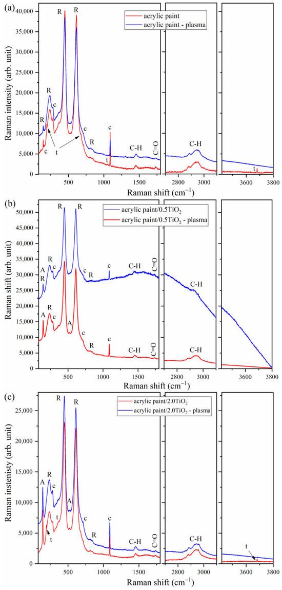 Raman spectra of untreated and plasma-treated samples of self-cleaning acrylic paints: (a) acrylic paint, (b) acrylic paint/0.5 TiO2, and (c) acrylic paint/2.0 TiO2. The Raman modes are assigned to anatase (A) and rutile (R) TiO2, calcite (c), and talc (t).