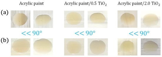 Observation of the contact angle (indicated with blue color) of car oil on self-cleaning acrylic paint (a) untreated and (b) plasma-treated surfaces with different contents of TiO2.