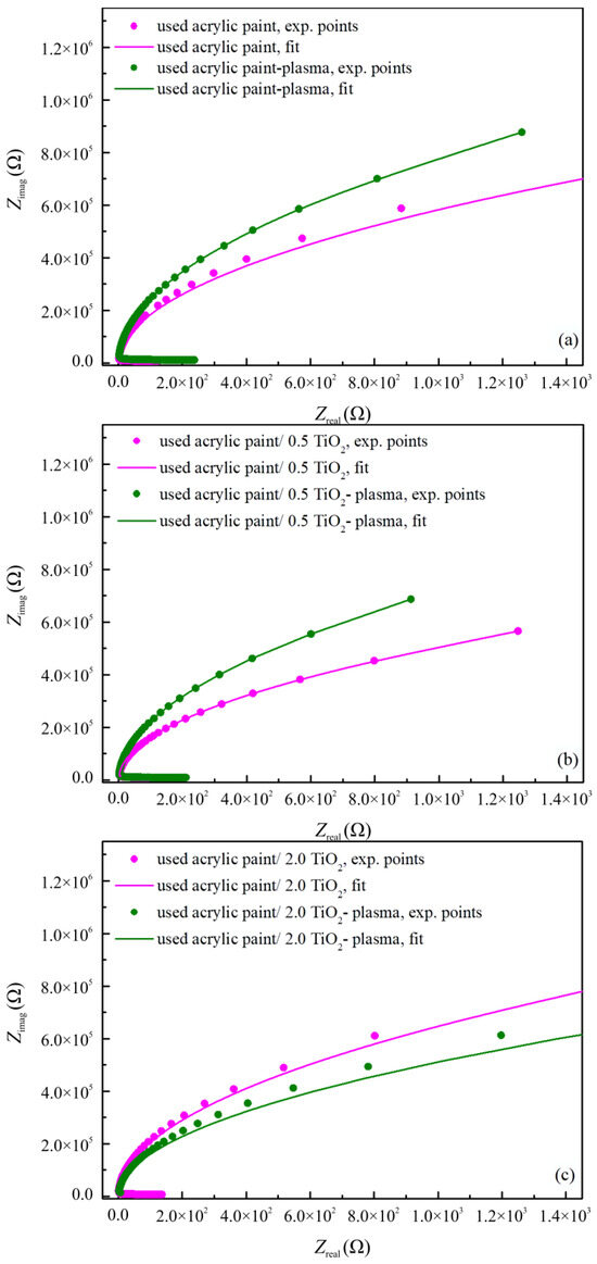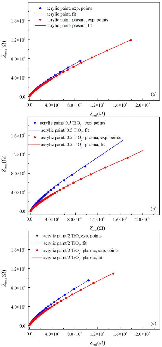 Figure 7 shows Nyquist plots for pristine samples and samples subjected to plasma treatment. The appearance of a single semicircular arc for all the spectra indicates that the procedure follows a single relaxation process in a given frequency interval. Also, the curves tend to be linearly lined up towards the Zimag in the low- and middle-frequency ranges, which refers to the highly insulated nature of these compounds and the significant contribution of grain boundaries in the conduction process. This can be explained by the porous nature of the prepared samples, as already confirmed by structural analysis, which causes the excess of electrolyte diffusion into the photoanode film, resulting in a high recombination rate of photogenerated electrons [33]. In addition, all semicircle centers lie below the real axis of the impedance, and the origin of these depressed semicircles in the complex plane can be attributed to the presence of porosity and inhomogeneities in studied samples [34]. Also, results show that treating with plasma significantly influences the impedance values only in the case of the acrylic paint/0.5 TiO2 sample (Figure 7b). Such a decrease indicates lower charge transfer resistance crosswise at the TiO2 substrate interface as a consequence of the contribution of oxygen vacancies in transport processes. This effect is much less pronounced in the spectra of acrylic paint/2.0 TiO2 compound due to the higher agglomeration of TiO2 particles that fosters electron–hole recombination. Also, as Raman measurements show, the intensity of the anatase modes increases with the amount of TiO2 powder, and the direct interface between anatase and rutile provides a trapping site for the hole and, at the same time, hinders the electron transfer.