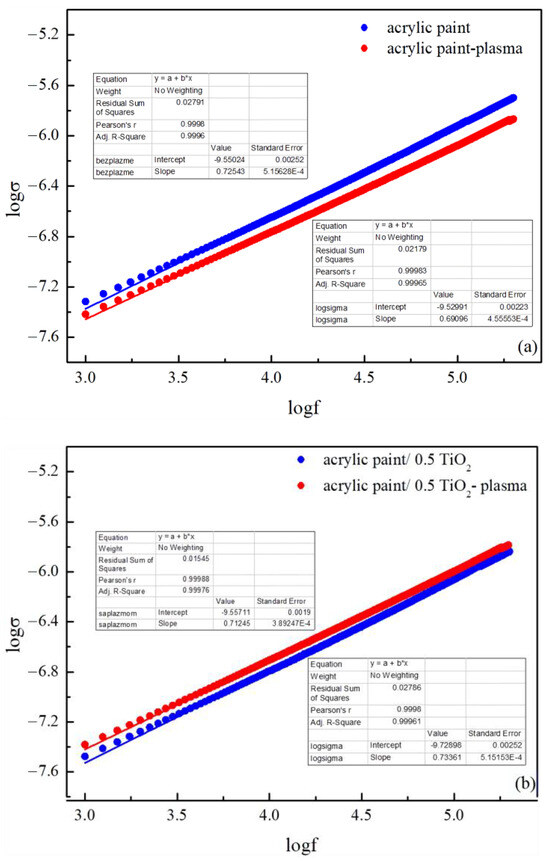 The variation in conductivity as a function of frequency at room temperature for pristine and plasma-treated samples is shown in Figure 9.