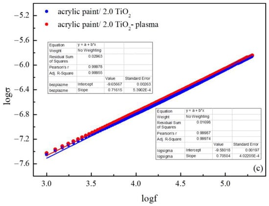 The frequency dependence of conductivity for the (a) acrylic paint, (b) 0.5, and (c) 2.0 acrylic paint/TiO2 surfaces.