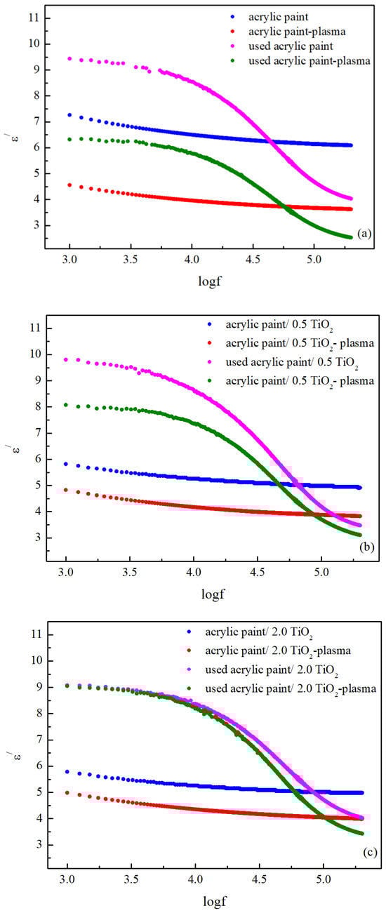Changes in the real part of dielectric permittivity concerning frequency for the (a) acrylic paint, (b) 0.5, and (c) 2.0 acrylic paint/TiO2 surfaces.