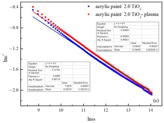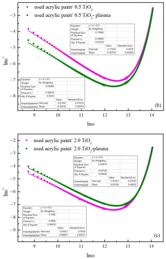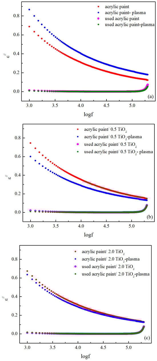 The frequency dependence of logarithm of dielectric loss for the (a) acrylic paint, (b) 0.5, and (c) 2.0 acrylic paint/TiO2 surfaces.