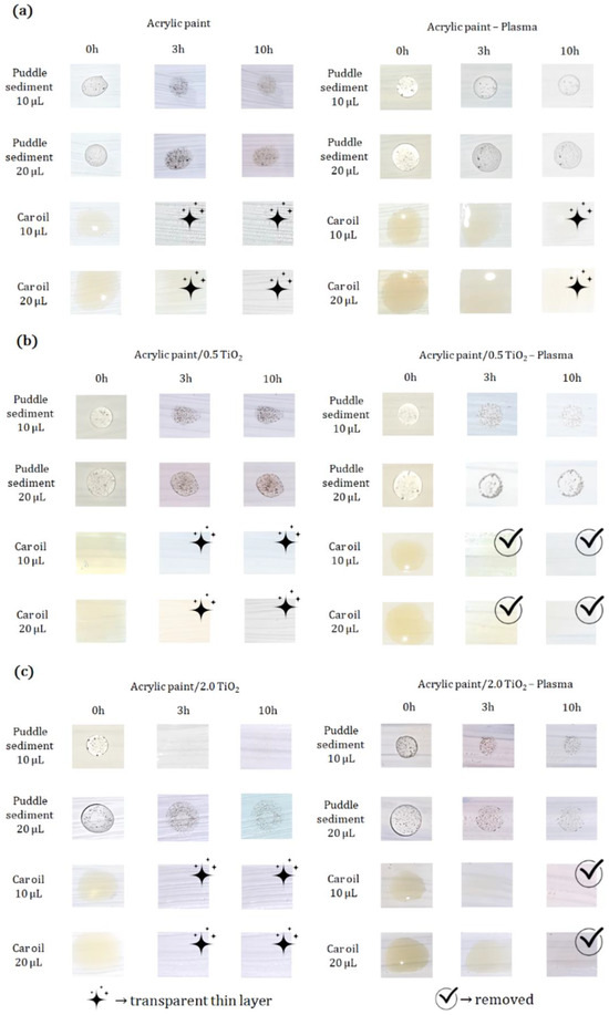 Untreated acrylic paint/0.5 TiO2 surfaces (Figure 14b) did not show efficacy in the removal of puddle sediment. At the same time, car oil faded within 3 h (10 and 20 μL, respectively) but remained as a transparent thin layer on the surfaces. On the other hand, using the plasma-treated acrylic paint/0.5 TiO2 surfaces, only traces of puddle sediment could be observed after 10 h of irradiation. Additionally, acrylic paint/0.5 TiO2 surfaces efficiently removed car oil within approximately 3 h (10 and 20 μL, respectively, Figure 14b).