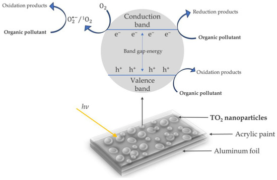 Based on the literature review, a tentative degradation mechanism is proposed (Figure 15). Car oil and puddle sediment are identified as organic pollutants in the environment. These pollutants can interact with e−/h+ on the surface of TiO2, leading to oxidation/reduction degradation products [43,44]. During the self-cleaning experiments conducted under atmospheric conditions, superoxide radicals () and singlet oxygen (1O2) were generated from the reaction of O2 with e− on the TiO2 surface [45]. These reactive oxygen species participated in a complex series of reactions that degraded the organic molecules, enhancing the removal efficiency of the pollutants [46].