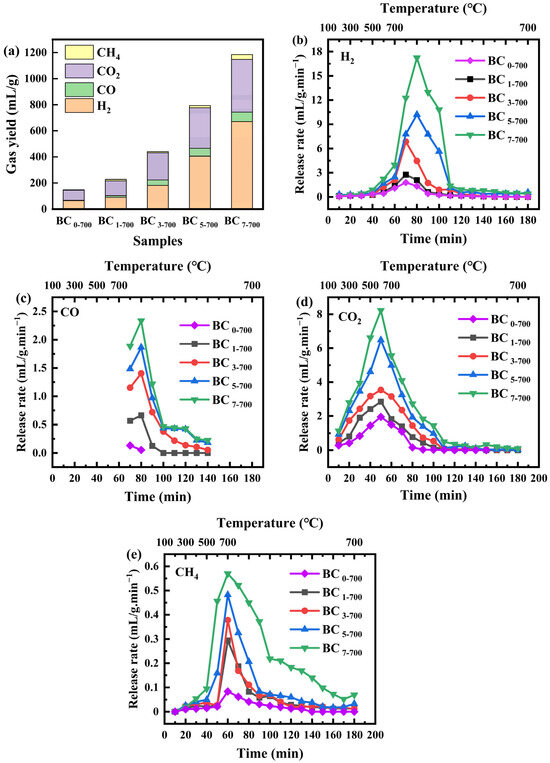 The gas release patterns with different KOH/BC ratios are shown in Figure 2. After the addition of KOH, the gas yield was significantly increased. As the KOH/BC ratio increased, a greater number of active groups of BC participated in the reaction, resulting in an increased release rate and amount of gas [23,28,29].