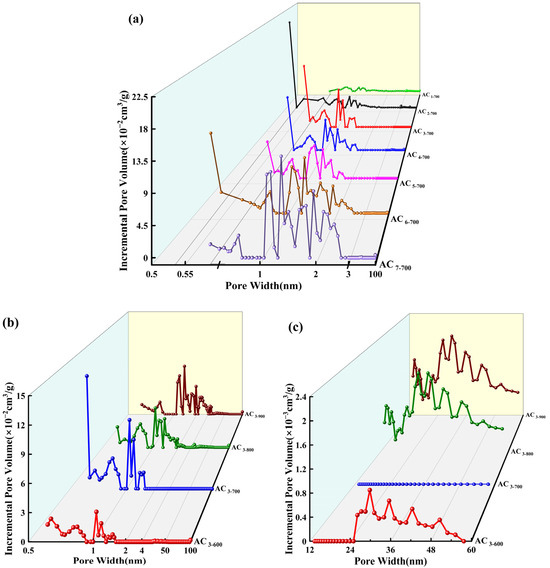 Figure 5. Pore size of ACs with (a) different KOH/BC; (b) different temperature; and (c) different temperature (12~60 nm).
