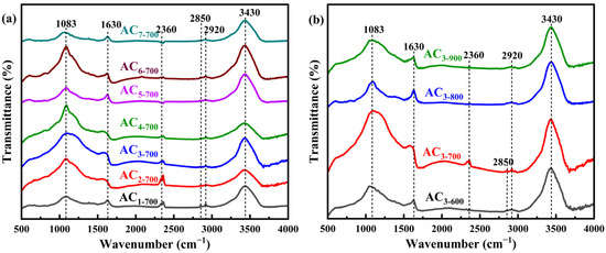 Figure 6. FT-IR of ACs with (a) different KOH/BC; (b) different temperature.