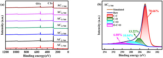 The relative contents of C, H, N, O, and S of ACs prepared under different activation conditions are shown in Table 1. When the activation temperature was 700 °C, the relative content of C in ACs initially increased and subsequently decreased with the increase of KOH/BC. In contrast, the relative content of O exhibited an opposite trend to that of C. This is mainly due to the fact that at a low KOH/BC ratio, the activator initially reacted with the O-containing functional groups (-COOH, -OH, etc.) of BC, thereby destroying the structure at the edge of the aromatic layer. This resulted mainly in a reduction of O [28]. As the KOH/BC ratio increased, more activators reacted with the carbon on the aromatic rings, thereby intensifying the degree of damage to the aromatic structure, which mainly decreased the relative content of C in the ACs. The relative content of the N decreased from 2.61 wt.% to 1.18 wt.% with the increase of the KOH/BC ratio, which was associated with the removal of N caused by KOH.