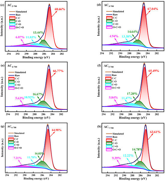 Figure 7. XPS C1s spectra of ACs with different KOH/BC ratios. (a) Full spectrum, (b) AC1-700, (c) AC2-700, (d) AC3-700, (e) AC4-700, (f) AC5-700, (g) AC6-700, (h) AC7-700.