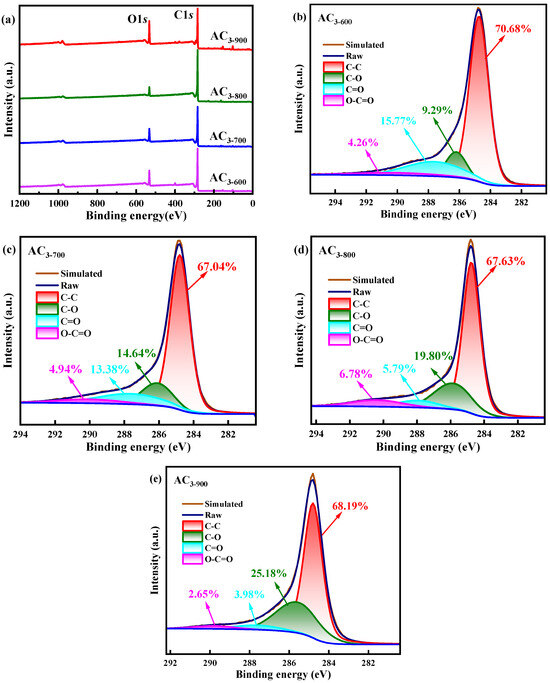 Figure 8. XPS C1s spectra of ACs with different activation temperatures. (a) Full spectrum, (b) AC3-600, (c) AC3-700, (d) AC3-800, (e) AC3-900.