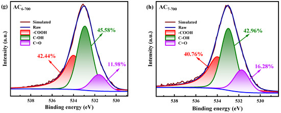 As shown in Figure 9b–h, the XPS O1s spectrum was fitted to carbonyl oxygen in COOR (C=O, 531.5 ± 0.2 eV), oxygen in hydroxyl (C-OH, 532.9 ± 0.3 eV), and carboxyl (-COOH, 534 ± 0.3 eV) [41]. C-OH and -COOH were the primary O-containing functional groups in ACs. As the KOH/BC ratio increased, the relative content of C-OH initially increased and subsequently decreased. In contrast, the relative content of -COOH and C=O followed an opposite pattern. The reasons for this are as follows: (1) At low KOH/BC ratios, activators preferably reacted with -COOH rather than C-OH, since -COOH is more acidic, which resulted a decrease in -COOH in ACs. (2) The relative content of the C=O decreased since C=O undergoes a hydrogenation reaction to generate C-OH at higher temperature, which also led to the increase of C-OH [42,43]. (3) When the KOH/BC ratio increased from 5 to 7, more C-OH groups reacted with KOH to form -OcK+. The electron-donating effect of K in -OK+ was transferred to the carbon ring or carbon chain through O, causing it to break at high temperatures [44], resulting in a reduction of C-OH.