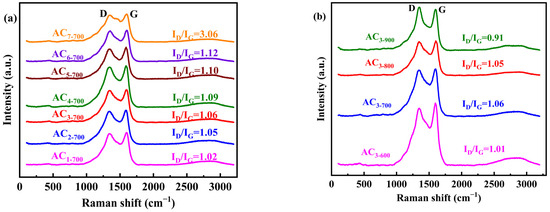 Typically, the graphitization and defects in ACs are evaluated by the intensity ratio of D bands (1350 cm−1) to G bands (1600 cm−1), known as the ID/IG ratio. A low ID/IG ratio represents greater lattice continuity, higher graphitization, and more aromatic rings of ACs [46]. The Raman spectra of ACs prepared with different activation temperatures are shown in Figure 11a. When the activation temperature was 700 °C, an increase in the KOH/BC ratio resulted in a reduction in the graphitization degree of the ACs, which can be attributed to an intensification of the damage to the aromatic structure of the ACs.