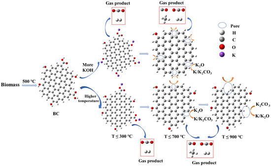 KOH has been used as an activator to produce activated carbon in two ways. One is the direct pyrolysis of the biomass and KOH mixture [18]. For the second method, biomass is pyrolysed at a lower temperature to produce biochar, which is then mixed with KOH and subsequently pyrolysed at 700–900 °C [19]. Compared to the first method, the second one has the benefit of a higher carbon content, larger SBET, more specific porosity, and improved adsorption capacity [20]. Lu et al. [21] obtained ACs, which were used to produce all-solid-state flexible supercapacitors with the SBET of 1815 m2/g and micropore ratio of 94%, by carbonizing mango seeds at 500 °C and then activating the mixtures of the biochar and KOH at 800 °C. The preparation of ACs is a complex process, and a large amount of research has reported on the effect of activation conditions such as the activation temperature or KOH ratio [22,23]. The study of the activation mechanism of the activated carbon preparation process is important for its use in supercapacitors, adsorbents, and catalysts. However, little research has focused on the chemical reactions between KOH and biochar (BC), and the process of pore structure generation has also not been well described.