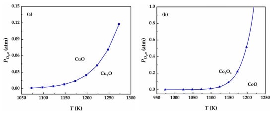 Equilibrium partial pressure of oxygen for (a) oxidation of Cu2O and (b) oxidation of CoO.