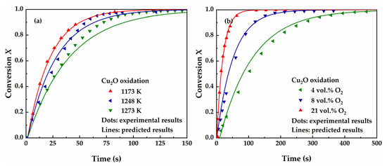 Comparison between the experimental results and the predicted results of Cu2O oxidation: (a) temperature effect (21 vol.% O2) and (b) O2 concentration effect (1173 K).