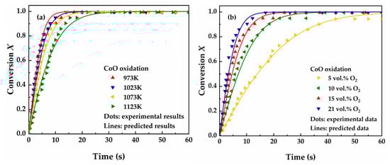 Comparison between the experimental results and the predicted results of CoO oxidation: (a) temperature effect (21 vol.% O2) and (b) O2 concentration effect (1023 K).