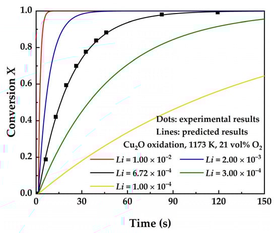 In the microkinetics rate equation theory, parameter Li is a dimensionless number that only relates to the physical properties of the solid reactant including the skeletal density of the solid reactant , the initial grain radius , and the density of the surface active site . As shown in Equation (37), parameter Li contains the ratio of the total oxygen capacity of the oxygen carrier to the number of active sites so that its value ranges from 0 to 1. If the value of Li is 1, it means that the number of oxygen anions that can be carried on the grain surface is equal to the number of oxygen anions that a whole grain can accommodate, in other words, there is no bulk phase diffusion. When the number of active sites is constant, the smaller value of Li indicates that the more oxygen anions the grain can hold. It is worth noting that the value of the initial grain radius is only related to the structure of the solid reactant. If the porosity and specific surface area of the solid reactant are larger, will be smaller and Li will be larger, resulting in a faster reaction rate. The effect of parameter Li on the oxidation kinetics of Cu2O is shown in Figure 4.