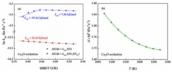 The effect of the apparent reaction rate constant and the reaction driving force on the reaction rate of Cu2O oxidation: (a) variation of reaction rate with temperature; (b) variation of apparent reaction rate constant and reaction driving force with temperature.