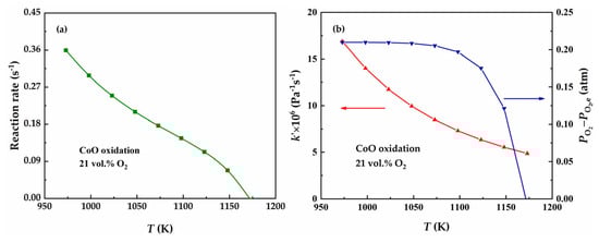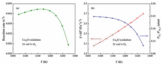 For the oxidation reaction of Cu2O, the reaction rates (i.e., the conversion rate) are calculated for the temperature range 1073–1273 K at the oxygen partial pressure of 0.21 atm, as shown in Figure 6. The reaction rate increases slowly with temperature in the temperature range of 1073–1173 K while decreases rapidly with temperature in the temperature range of 1173–1273 K. Obviously, the reaction rate is influenced by both kinetics and thermodynamics, corresponding to and in the reaction rate equation. As shown in Figure 6, increases with temperature, whereas decreases with temperature, and the rate of decrease accelerates. As a result, before 1173 K, the effect of on the reaction rate plays a dominant role, resulting in an increase in the reaction rate. After 1173 K, plays a dominant role, resulting in a decrease in the reaction rate. Therefore, the effects of kinetics () and thermodynamics () are opposing and competitive, jointly influencing the overall reaction rate.