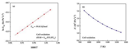 For the Cu2O oxidation, after considering the effect of the reaction driving force, a positive value of apparent activation energy can be obtained. However, it does not mean that for reactions in which the reaction rate decreases with temperature, a positive activation energy can be obtained as long as the effect of the reaction driving force is considered. For the CoO oxidation, the apparent reaction rate constants are calculated using Equation (8), and the Arrhenius plot is shown in Figure 7. Different from Cu2O oxidation, the apparent reaction rate constant decreases with temperature, and a negative apparent activation energy (−59.41 kJ/mol) is still obtained although the effect of reaction driving force is considered. For Equation (9), the activation energy is −56.93 kJ/mol, which is calculated using Equation (13) and DFT results. The apparent activation energy obtained using Arrhenius equation is slightly lower than the activation energy obtained through Equation (13). Because the pre-exponential factor decrease with temperature, as shown in Figure 7b. According to Equation (12) and Figure 7b, the partition function ratio of the transition state to the reactants also decreases with temperature. Although the apparent activation energy of the overall oxidation reaction of CoO is negative, the energy barriers of the two elementary reactions are not negative.