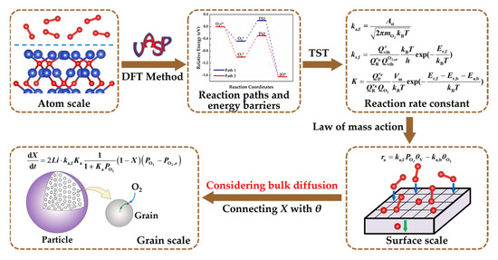 Previous studies adopted apparent kinetic models [20,21,22,23,24,25,26], without considering the detailed elementary reactions occurring on the surface and the lattice oxygen diffusion occurring inside the bulk phase. The reaction rate constants were obtained by fitting the experimental data with the calculated results of apparent kinetic models, and the activation energy and the pre-exponential factor were obtained by fitting the logarithm relationship between the reaction rate constants and the reciprocal of temperature based on the Arrhenius equation [20,21,22,23,24,25,26]. Obviously, previous methods did not consider the microscopic reaction mechanism and were very dependent on experimental data and apparent kinetic models.
