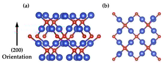 Crystal structure of Cu2O in the DFT calculations: (a) bulk structure and (b) Cu2O(200) surface (blue: copper; red: oxygen).