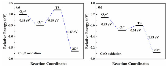 The crystal structure of Cu2O is shown in Figure 10, and the Cu2O(200) is chosen as the objective surface to conduct the DFT calculation. The reaction path of the reduction O2 on the Cu2O(200) is shown in Figure 11a. This is carried out in two steps: (i) the O2 molecules are adsorbed on the Cu top, as shown in Equation (R.6); (ii) The adsorbed O2 molecules react with Cu2O resulting in the breakage of O=O bonds and the formation of Cu-O bonds, as shown in Equation (R.7). The energy barriers of the two steps calculated by the DFT method are listed in Table 2.