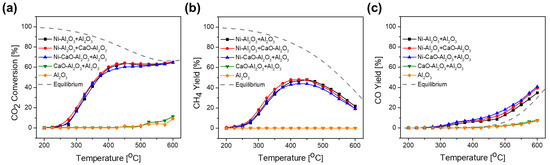 Figure 5a–c depicts the results of CO2 direct methanation over Ni-Al2O3, a Ni-Al2O3 + CaO-Al2O3 mixture, and Ni-CaO-Al2O3 DFM. While these results do not directly represent the performance in ICCM, they provide insights into catalytic activity during CO2 direct methanation and the distribution of potential products in the temperature range from 200–600 °C. Al2O3 was mixed to ensure that there would be consistent catalyst bed volume and content of Ni and CaO within the catalyst bed. The activities of both Al2O3 and CaO-Al2O3 were found to be negligible, with CO2 conversion rates below 0% in the low-temperature region (200–300 °C) and less than 10% even in the high-temperature region above 500 °C. No CH4 formation was observed with Al2O3 and CaO-Al2O3 across all temperature ranges, and only trace amounts of CO were detected above 300 °C. These observations suggest that only metallic Ni is catalytically active in the methanation reaction, and that the formation of CO can be attributed to either the reverse water-gas shift reaction or the hydrogenation of carbonate species, as observed in the H2-TPSR of CaO-Al2O3 [56]. No significant differences in catalytic activity were observed among the Ni-Al2O3, Ni-Al2O3 + CaO-Al2O3, and Ni-CaO-Al2O3 samples. During CO2 direct methanation, no substantial interaction was observed between Ni and CaO when they were integrated or supported separately on Al2O3 particles.